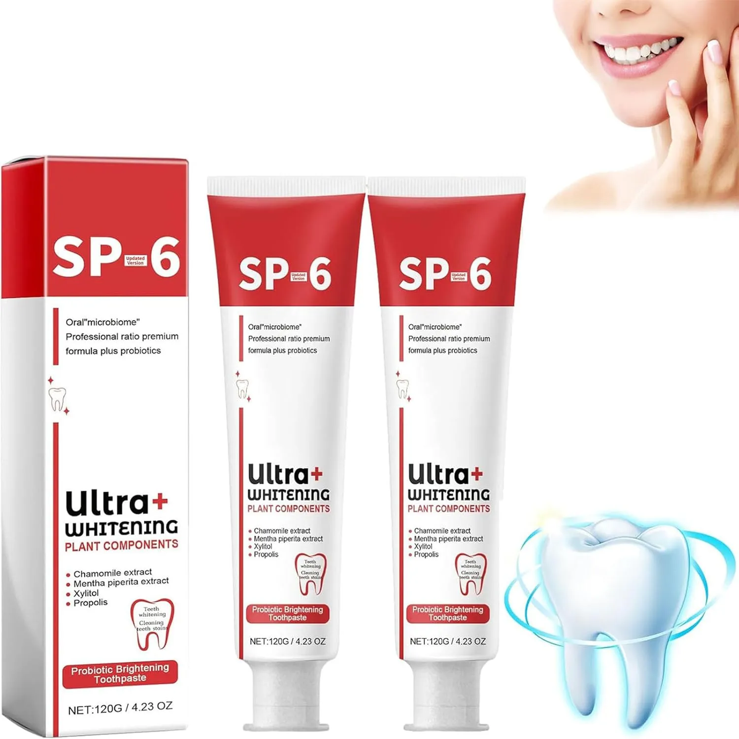 Experience the future of oral care with SP6 Probiotic Toothpaste, a clinically formulated blend that combines six active probiotic strains, nano-hydroxyapatite, and plant-based brightening agents to deliver a gentle yet powerful whitening effect. Unlike traditional peroxide-based formulas, SP6 works by balancing your oral microbiome, helping to reduce bad bacteria, strengthen enamel, and promote long-term gum health.
